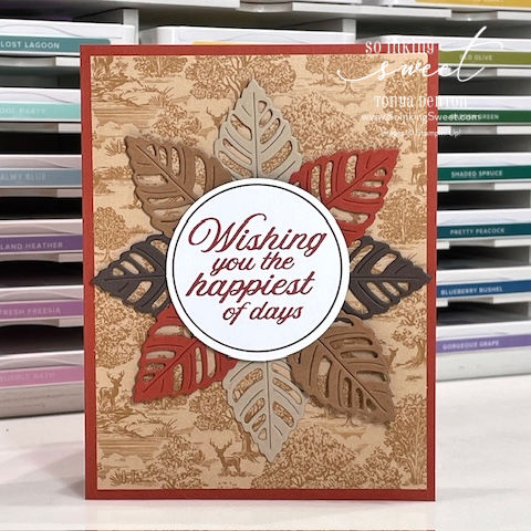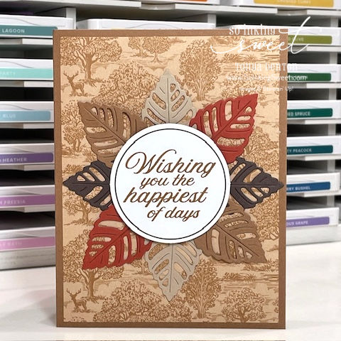Then I decided I wanted something to go around the circle sentiment label and I thought of a wreath of leaves. I have been collecting the Add-On dies since they became available and I pulled out the one with the leaves. I used Cajun Craze, Early Expresso, Pecan Pie, and Basic Beige card stock for my die-cut leaves. I did two of each color. I used Glue Dots to adhere the leaves and the sentiment label. Simply done and look at the details of those leaves!