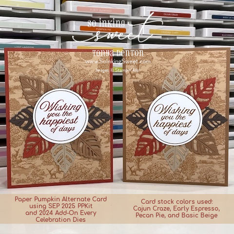 My Paper Pumpkin Fall For Toile alternate card came together rather nicely. Let me start with the die-cut leaves. Starting back in January 2024, Stampin’ Up! started offering coordinating dies specifically as an Add-On item for Paper Pumpkin Subscribers. So every quarter (in this case JAN, FEB, and MAR) there would be coordinating dies to go with those particular Paper Pumpkin kits, which includes stamp sets. In other words, these Add-On die sets coordinate with the stamp set/kits.