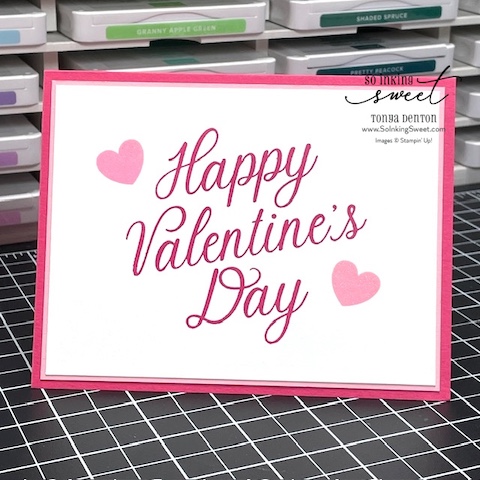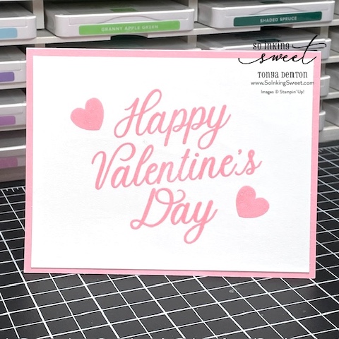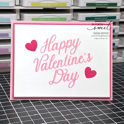This is still a basic card but stepped up a bit with multiple front panels. The card base is Melon Mambo cardstock and stamped with Melon Mambo Classic Stampin’ Pad. The Pretty in Pink panel is cut at 5-1/4″ x 4″ and the Basic White is 5-1/8″ x 3-7/8″. Stamp the sentiment and hearts before adhering it to the Pretty in Pink panel and then adhere to the card base. Notice I stamped the hearts in Pretty in Pink.