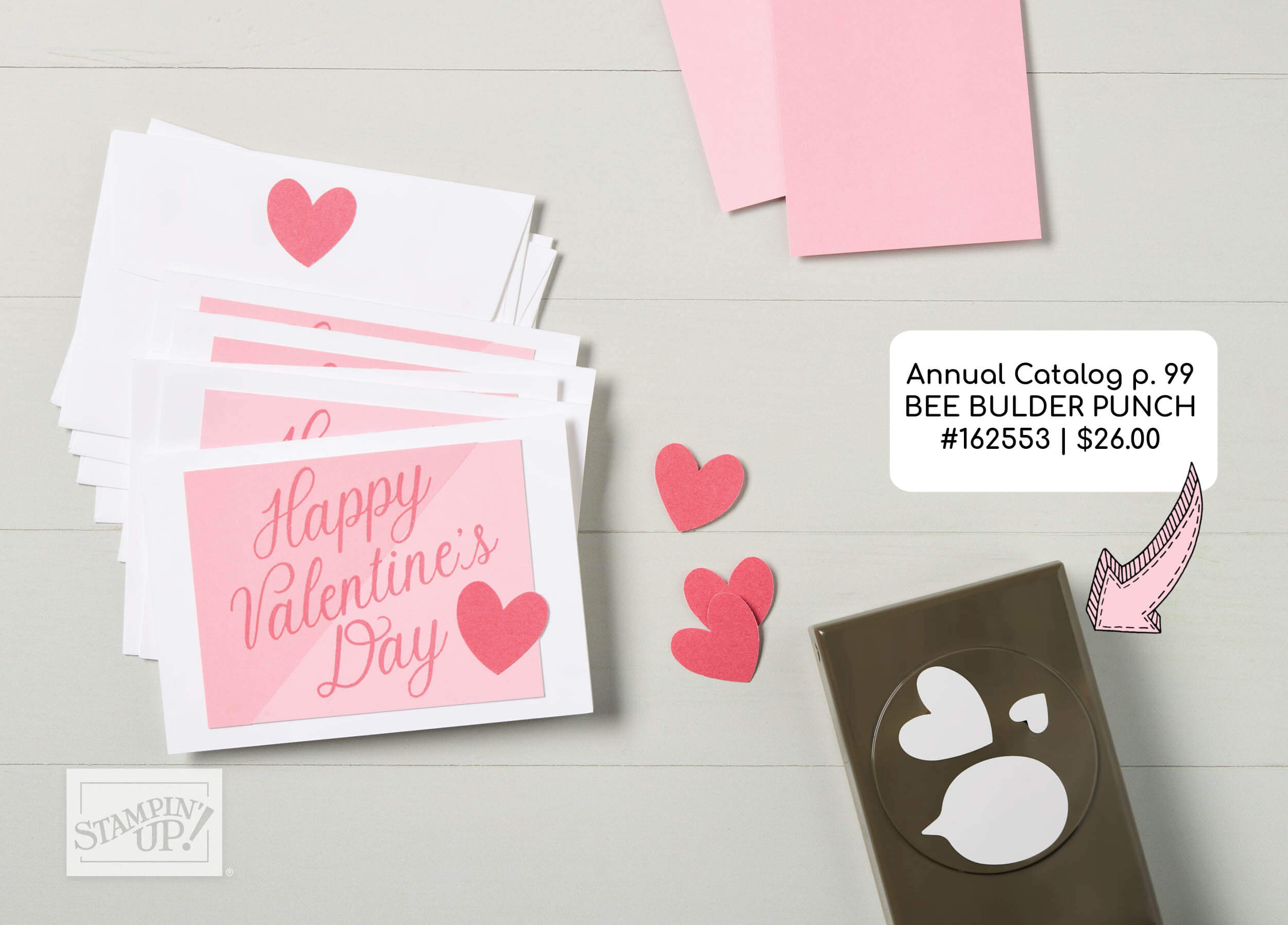 Notice the NEW packaging for Stampin’ Up!’s stamp sets, which is the same for die cuts. To make the sample card you see above, take two coordinating cardstock colors and cut them at the same angle and then adhere them together. Add a punched heart by using the Bee Builder Punch (see below). It’s just another simple and quick card when making a lot of multiples!